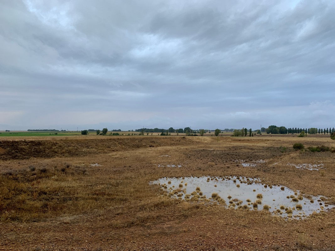 Following a noisy night, we left early with rain gear, awaiting a coffee break seventeen kilometers later in Calzadilla de la Cueza. We pushed on to Terradillos de los Templarios, where the long, flat path invited meditation and reflection.