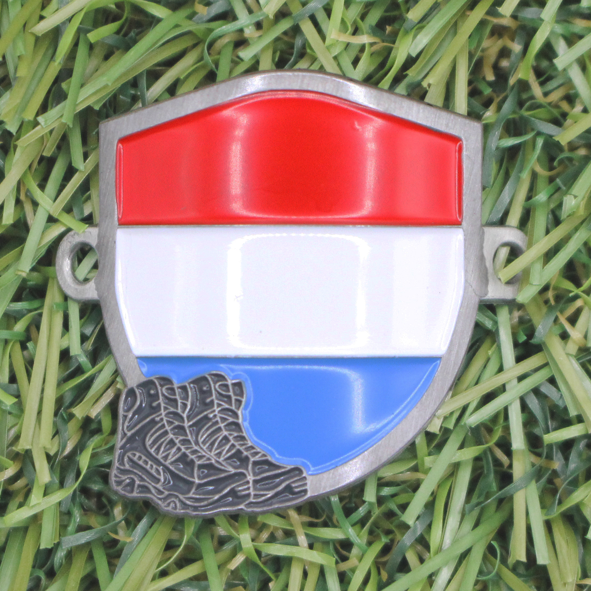 Luxemburgische Flagge mit Wanderstiefeln (Wanderstockschild). Dank der speziellen Form und dem 3M-Klebematerial sowie den drei mitgelieferten Nägeln lässt sich unser Wanderstockschild ganz einfach am Wanderstock befestigen.