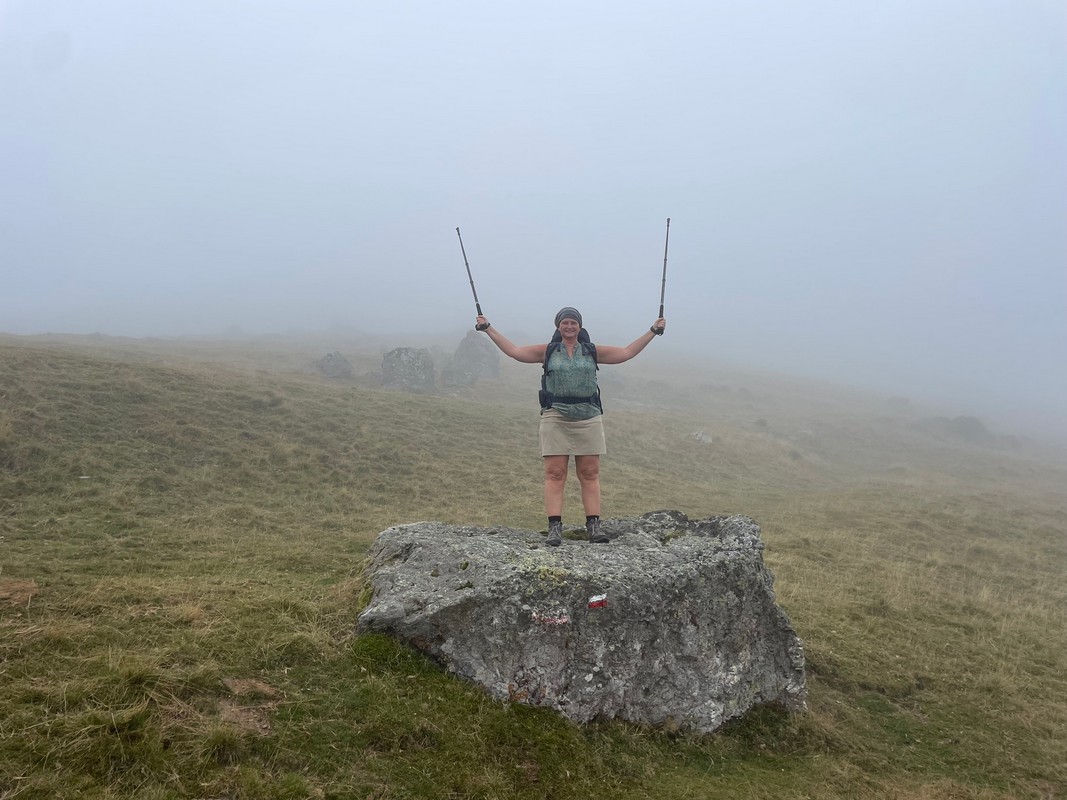 Na een vroeg ontbijt gaan we op pad. De mist hangt nog over de bergen, het uitzicht blijft verborgen, maar we horen wel de bellen van schapen in de verte. Onderweg sluiten twee Duitse pelgrims zich bij ons aan: Flow en Alex. Het gezelschap maakt de klim aangenamer en we praten onderweg over van alles. Hun energie werkt aanstekelijk.
