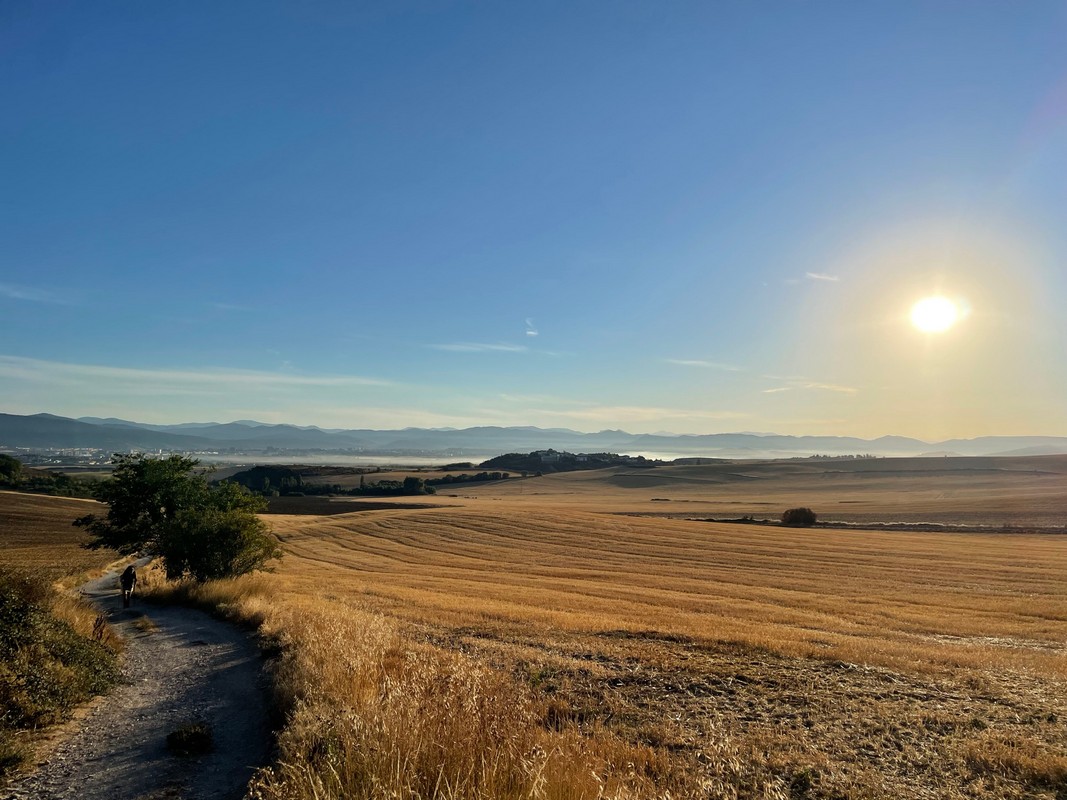 Na een gezellige avond met Andy en Marty gaan we op tijd slapen. De volgende ochtend vertrekken we in het donker. De heuvel af, richting Los Arcos. De lucht toont zich dramatisch met donkergrijze wolken terwijl de zon opkomt. Door het tegenlicht ontstaan lange schaduwen voor ons een prachtig begin van de dag.